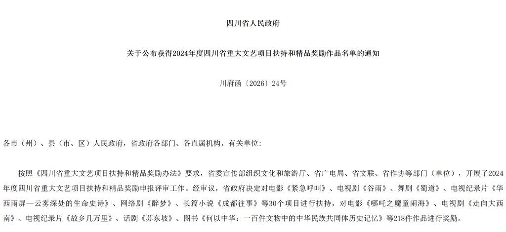 2月7日,四川省人民政府网站公布《四川省人民政府关于公布获得2024年度四川省重大文艺项目扶持和精品奖励作品名单的通知》。