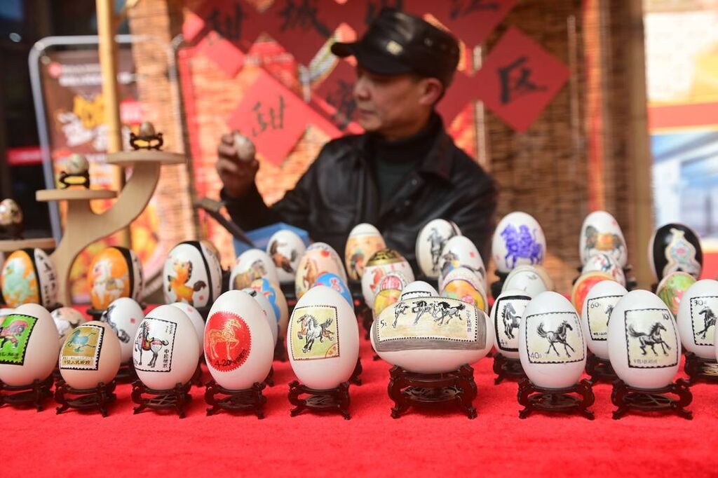 马年主题蛋壳画展位独具匠心,非遗代表性传承人将细腻的笔触落在小小的蛋壳上,奔马、祥云、“福”字等元素巧妙融合,色彩鲜艳、寓意吉祥的蛋壳画作品,成为市民争相观赏的焦点。“今年是马年,这样的蛋壳画既精致又有纪念意义,太喜欢了!”市民李女士拿着刚购买的蛋壳画,连连称赞。