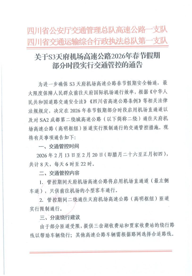 2026年春节假期部分时段实行交通管控