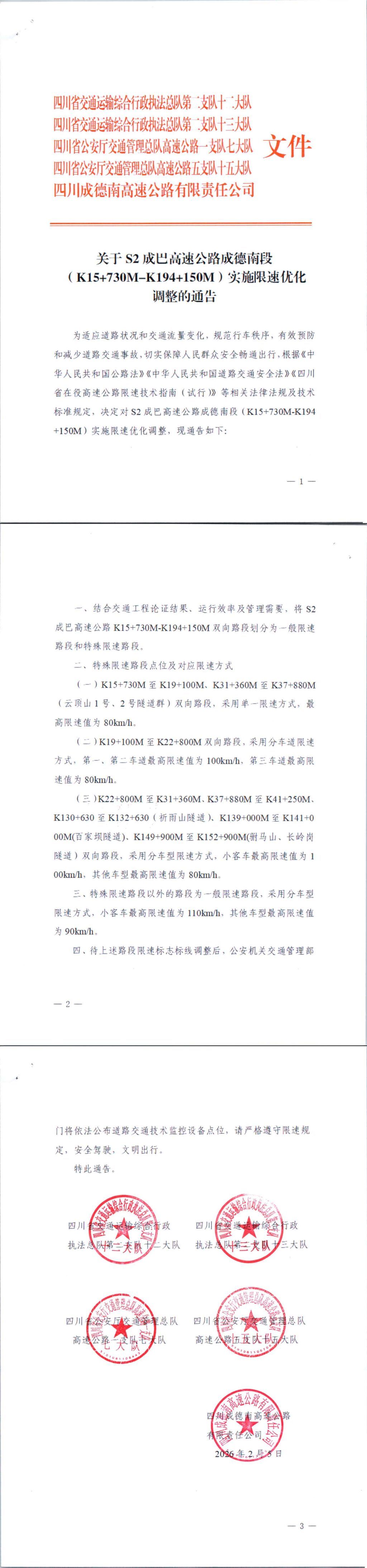 为进一步提升道路通行安全与效率,根据相关法律法规及技术标准,S2成巴高速公路成德南段(K15+730M-K194+150M)将实施限速优化调整,敬请广大驾驶员知悉并遵守。