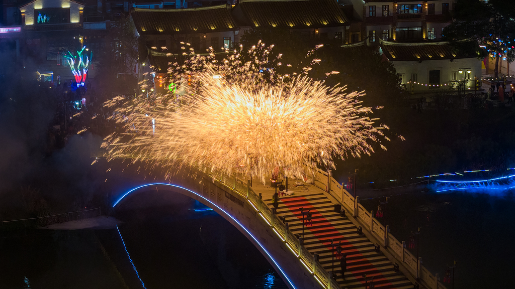 2月6日,福建漳州,千年非遗打铁花在闽南水乡永兴桥倾情上演,现场气氛热烈。
