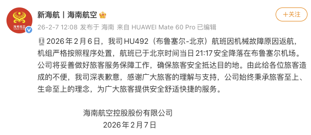 ·海航一飞往北京航班因机械故障返航。