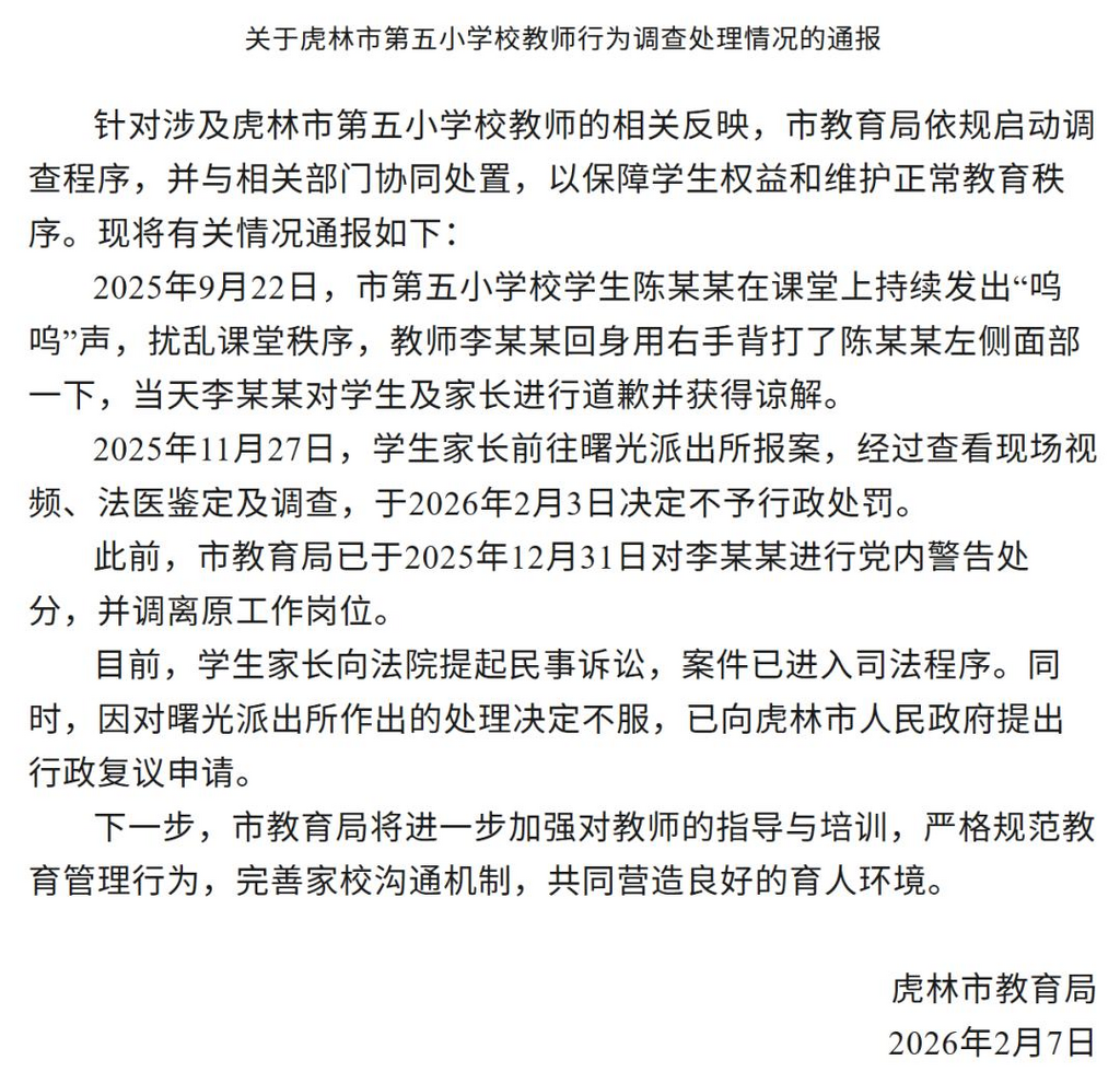 ·小学教师用手背打学生脸,黑龙江虎林教育局通报:涉事教师已道歉并获得谅解,被打学生家长已提起民事诉讼。