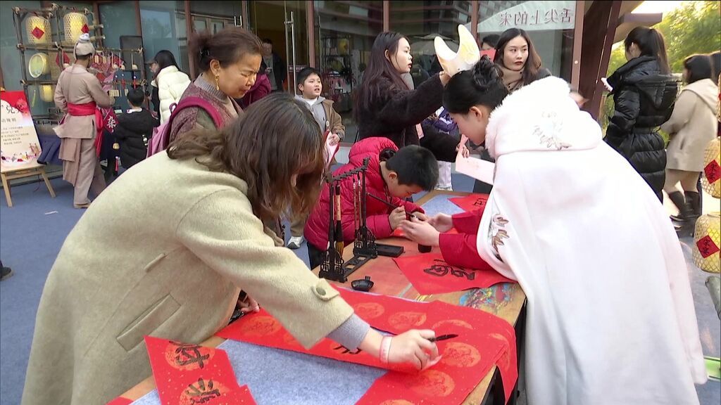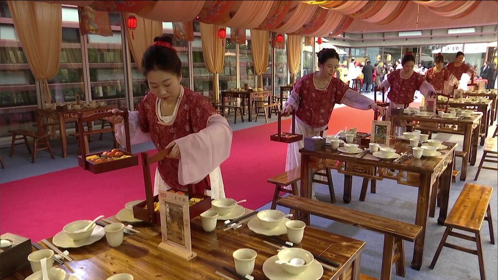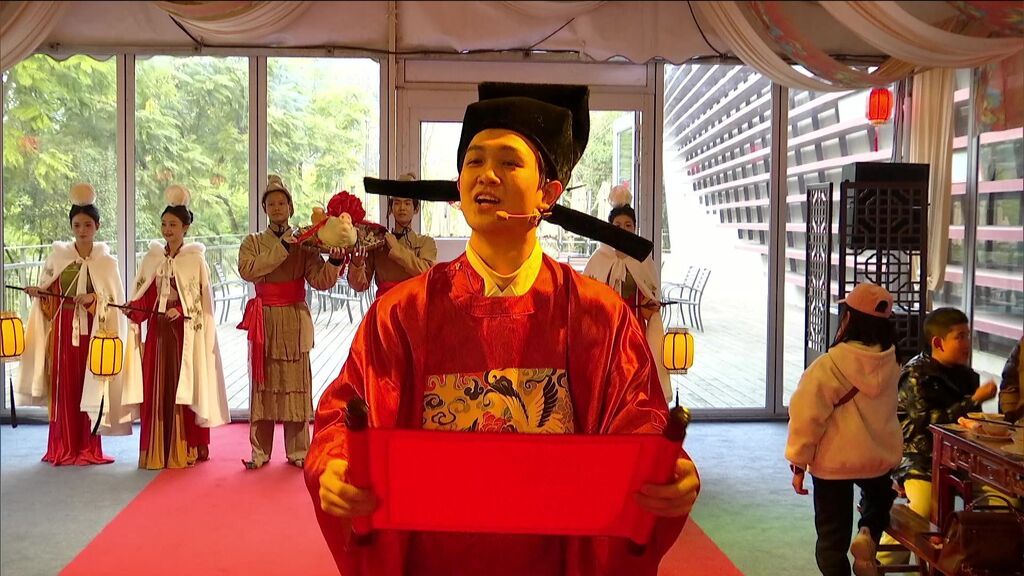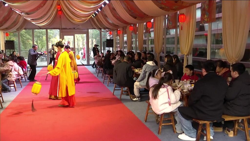 傍晚,“泸川宋宴”沉浸式年夜饭准时开席。这可不是普通的晚餐,从案几摆放、餐具制式,到每一道菜品,都参照宋代典籍复原,全力还原南宋宴饮习俗。席间还有南宋歌舞、对诗、抽奖等环节,游客不再是隔着展柜看历史,而是在沉浸式场景中,真切感受南宋时期的年味。