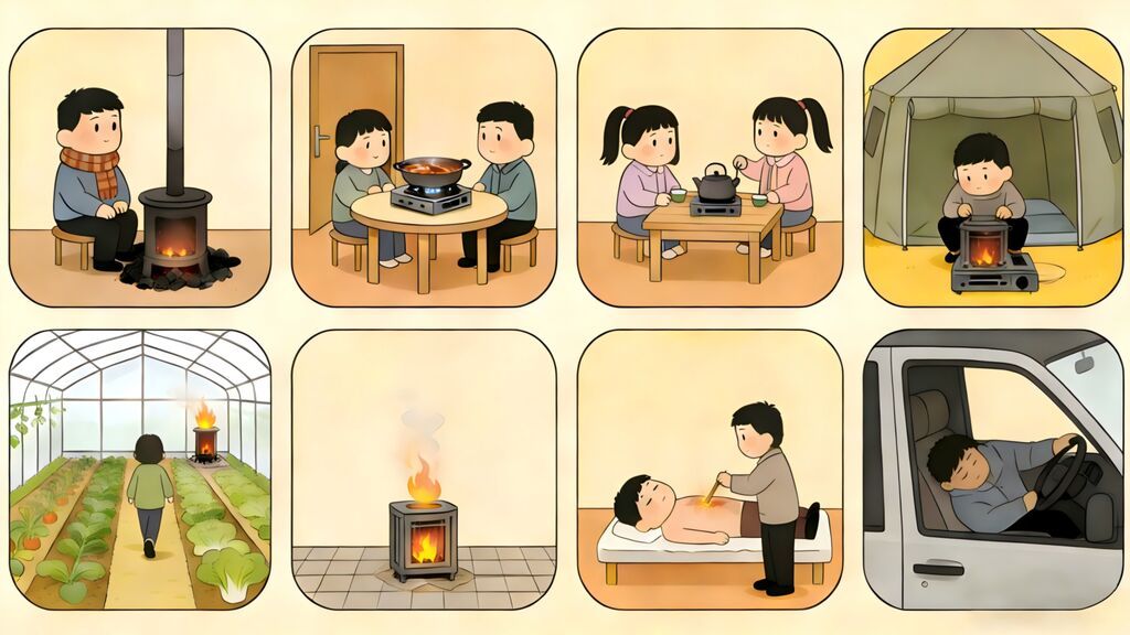 4.野外露营:密闭帐篷内使用炭火或卡式炉取暖或烹饪。