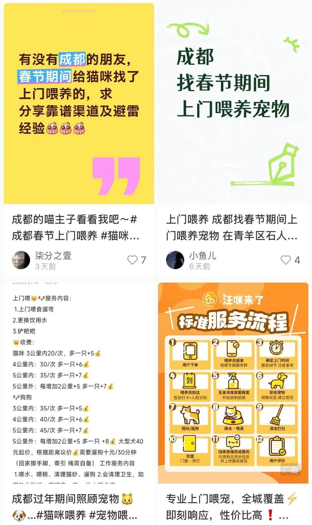 与此同时,一种更灵活的服务模式——“上门喂养”在宠物圈流行起来,在闲鱼、小红书等平台搜索相关服务,能找到大量提供上门喂食、清理、陪伴服务的个人和商户。记者发现,个人日常上门喂养宠物最低价约30元/次,春节期间普遍上涨40%以上,具体因区域、宠物数量等略有差异。有从业者分享,往年春节期间单日收入可达千元,足见市场需求旺盛。