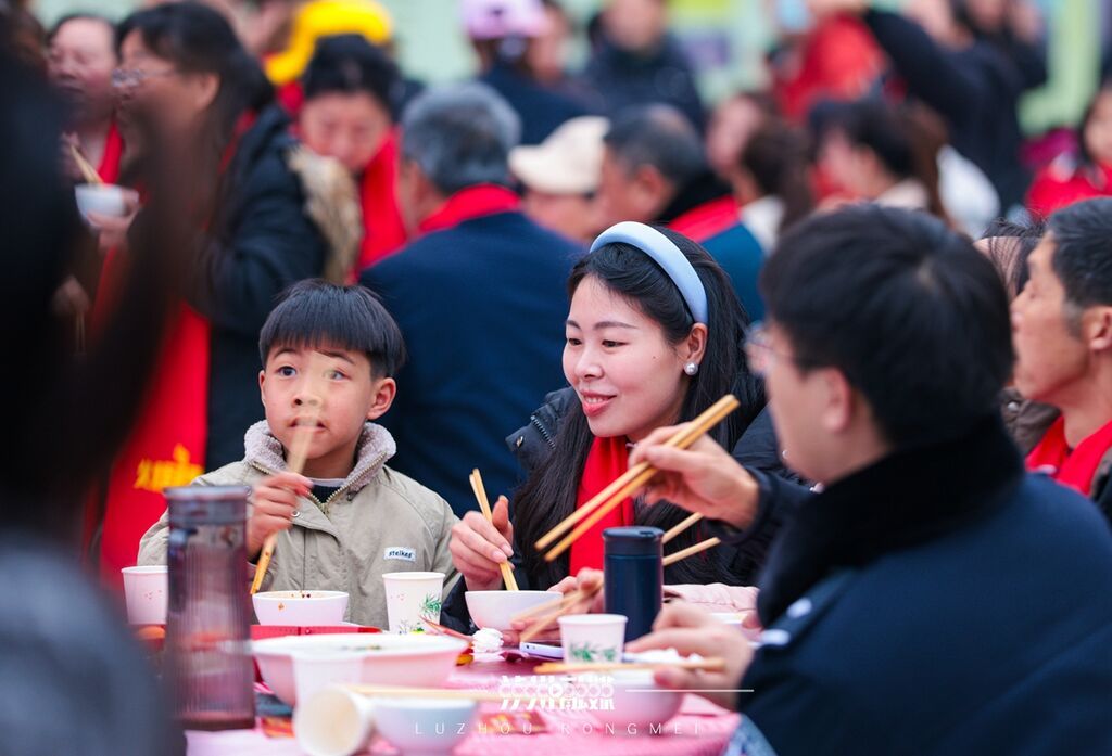 傍晚6点,暮色渐浓,一场特殊的团圆宴拉开帷幕。社区志愿服务工作者推着餐车穿行,腊味合蒸的香气裹着乡音在圆桌间流转。舞台上,两位“火三代”主持人引领晚会进程,一位12岁的男孩以其精湛的川剧变脸表演,展现出“火三代”的风采。“火二代”华韵艺术团的舞蹈《婵娟》、大渡口镇小学校童声合唱团的《瑶山夜歌》,还有杂技魔术等10余个节目渐次展开,精彩纷呈。欢声笑语回荡在老社区,浓浓年味和邻里温情直抵人心。