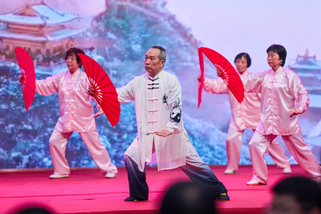 “肖婆婆,今天你好美哟!”今年80岁的肖惠君老人当天早早化好了妆,由她领衔的“火一代”夕阳红健身队自编舞蹈《欢聚一堂》被安排在第一个出场。下午4点,从各地赶来的宾客陆续到场,广场上人头攒动,她顾不得化了许久的妆容,客人来了她带头招呼,笑得合不拢嘴。