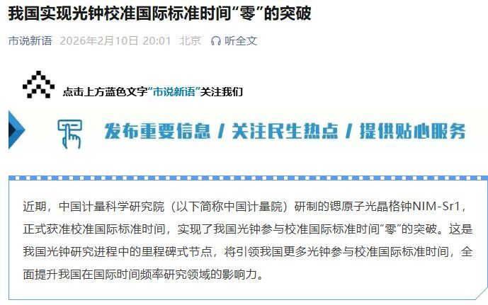 近期,中国计量科学研究院(以下简称中国计量院)研制的锶原子光晶格钟NIM-Sr1,正式获准校准国际标准时间,实现了我国光钟参与校准国际标准时间“零”的突破。这是我国光钟研究进程中的里程碑式节点,将引领我国更多光钟参与校准国际标准时间,全面提升我国在国际时间频率研究领域的影响力。