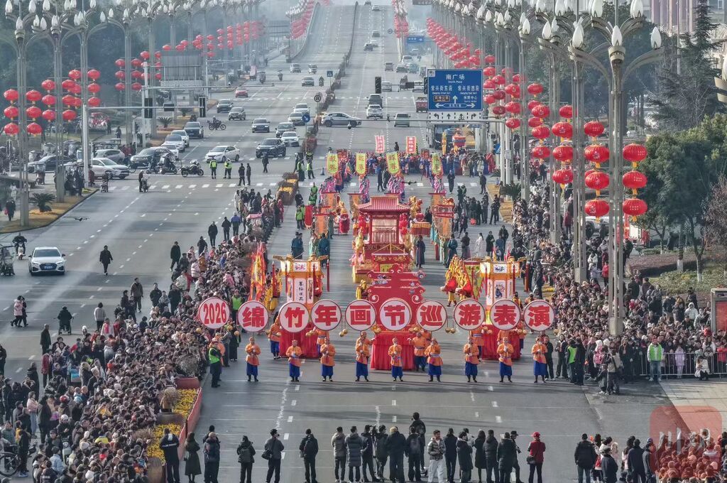 “这是只有在我们绵竹才能体验到的年味!”当天上午开幕的2026年第二十五届绵竹年画节上,一位绵竹市民倍感自豪。在德阳绵竹市体育中心广场前,由1400多名群众演员参与的“画里游春·绵竹寻年”民俗巡游,让清代《迎春图》中的460多个人物“活”起来。
