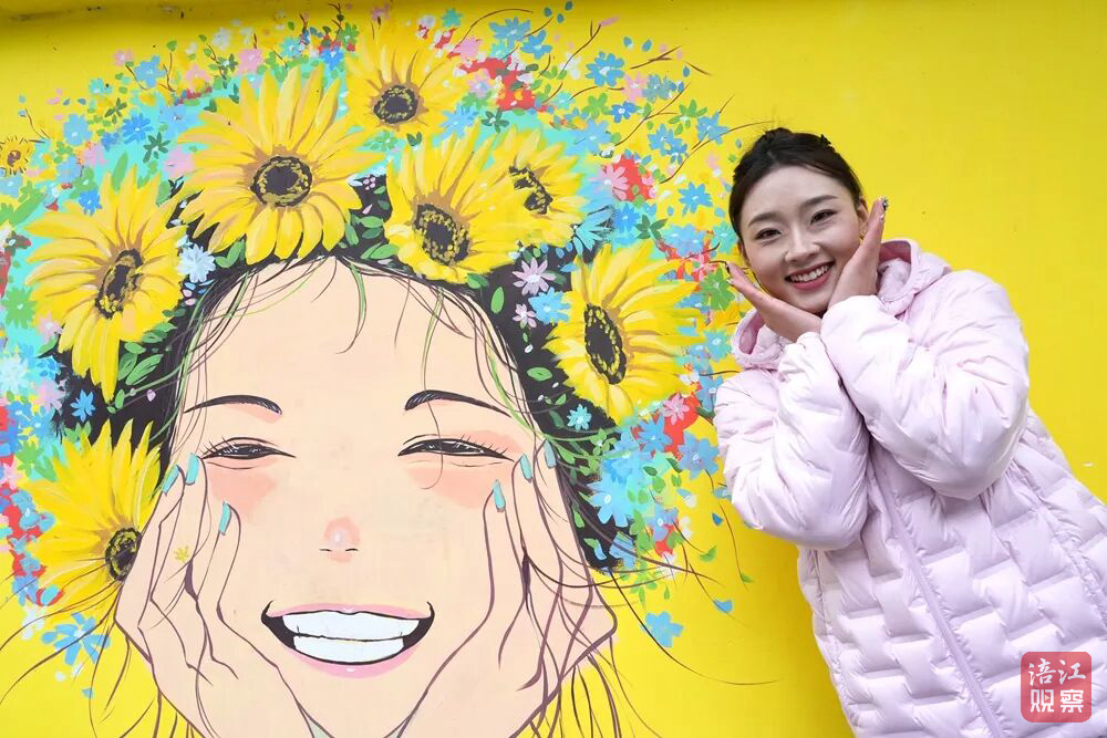 “你看这幅向日葵墙绘,好多年轻人专门来拍照!”正在拍照的市民王女士指着路边一幅色彩明艳的墙绘说。墙绘前,一位穿浅粉色羽绒服的姑娘正“摆poss”,身后戴向日葵花环的女孩笑得灿烂。阳光洒在黄色墙面上,连空气里都飘着轻松的味道。