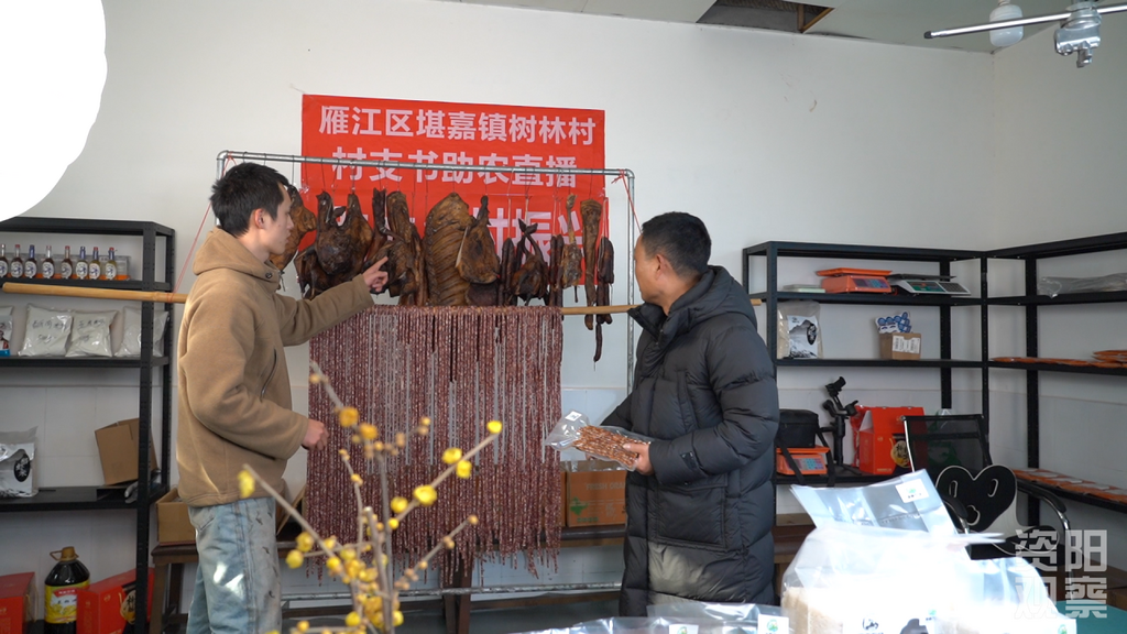 冬日,资阳市雁江区堪嘉镇树林村电商中心院坝里,一排排油亮亮的香肠、腊肉在冬日暖阳下散发出诱人的光泽。村支书王陈的手机镜头正对准这些“年味”,“咔”的一声,配上几句地道四川话:“乡亲们自家粮食喂的土猪,香得很!三、二、一,上链接!”