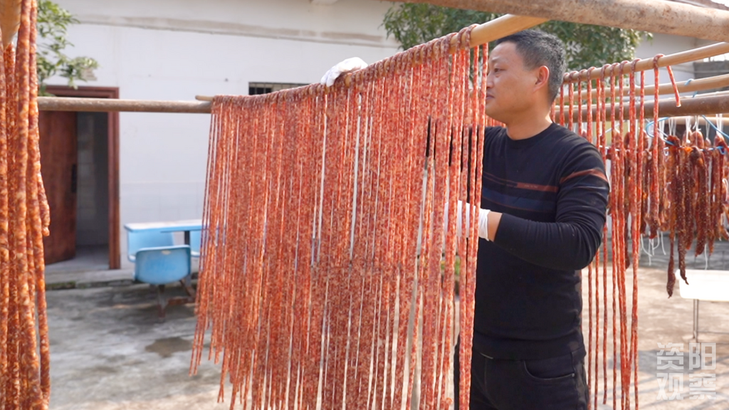王陈正在晒香肠。