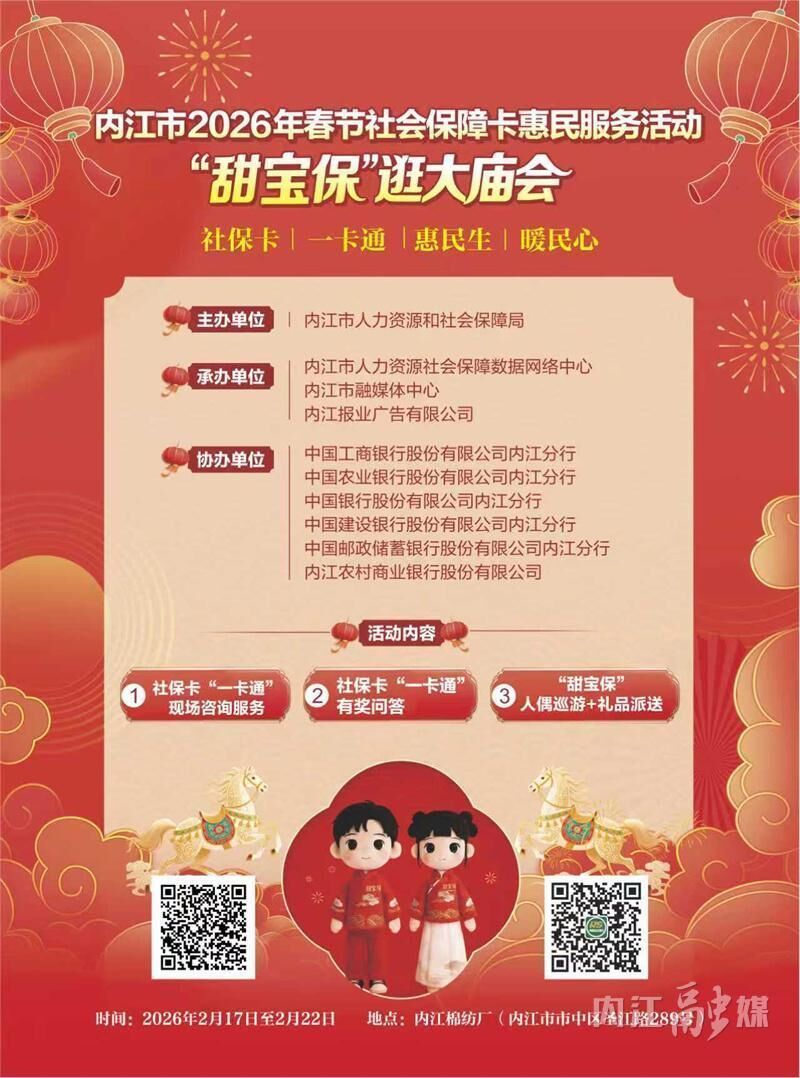 2026年春节期间,内江市人力资源和社会保障局将联合社保卡合作发行银行,共同推出“甜宝保逛大庙会”社保卡惠民服务活动。此次活动旨在进一步宣传社会保障卡“一卡通”功能,拓展应用场景,让市民在欢乐祥和的节日氛围中了解社保卡、用好社保卡。