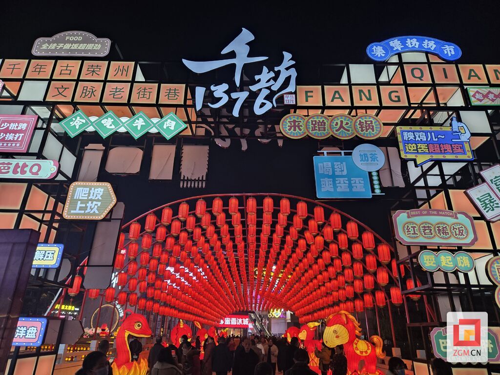 当晚的千坊1376商业街人头攒动,玩灯节突破传统灯会静态观赏模式,沿河岸打造的梦幻灯光秀将“荣州八景”的诗意风华融入光影画卷,铺展出一条 “行进式 + 沉浸式”夜游动线。本土及新锐乐队的现场演出在古街回荡,摇滚、民谣的旋律与光影特效交织,构建起传统与现代对话的多维声场空间,让夜游体验更具层次感。现场各类科技智能灯组更是吸睛无数,4米高的川剧变脸智能灯组凭借机械控制实现抬手遮脸、脸谱变幻,让非遗绝技在光影中焕新;涅槃重生智能灯组以七彩流光模拟凤凰浴火场景,配合雷电音效与互动触发功能,带来震撼的视觉体验;十二生肖灯组错落排布在坊巷间,憨态可掬的造型呼应马年新春,成为市民打卡的热门点位,福字灯杆连成的灯笼长廊更是将节日氛围拉满。