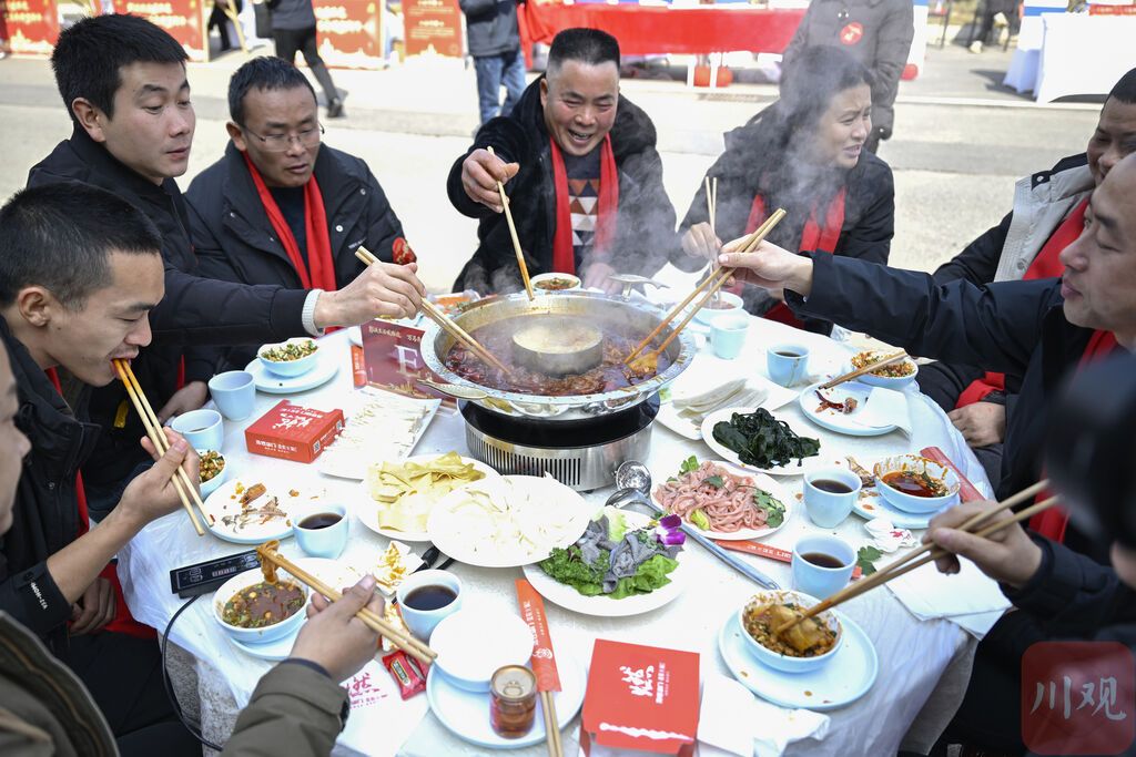 2月11日,南方小年,省市县交通部门“请客”,川观新闻携手京东超市送上暖心年货,来自天南海北的上百位货车司机围坐在一起,吃一顿团年火锅。
