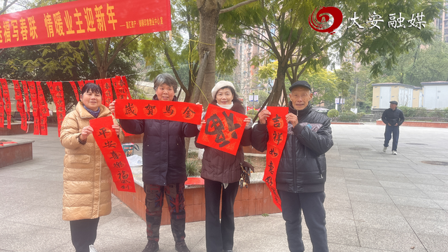 福赠邻里,墨香年味暖人心。接过墨迹未干的福字、春联,居民们喜笑颜开,纷纷合影留念。“手写的春联有温度,墨香里都是年味儿!”一位阿姨的感慨道出大家的心声。此次活动历时近3小时,书写福字150余张、春联100余副,既送了祝福,也让居民在互动中感受中华传统文化的魅力。