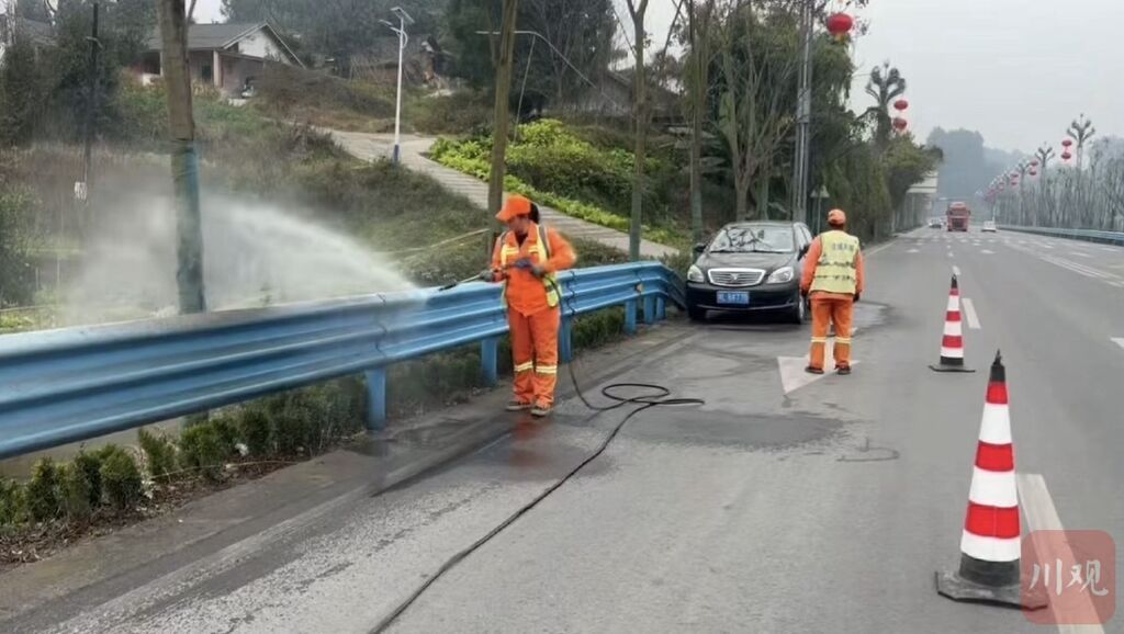 在犍为县,保洁人员在冲洗公路护栏