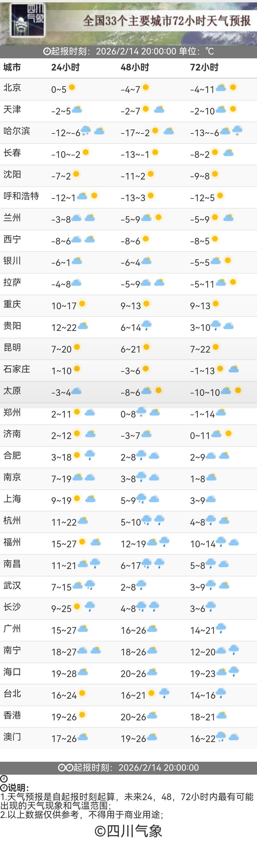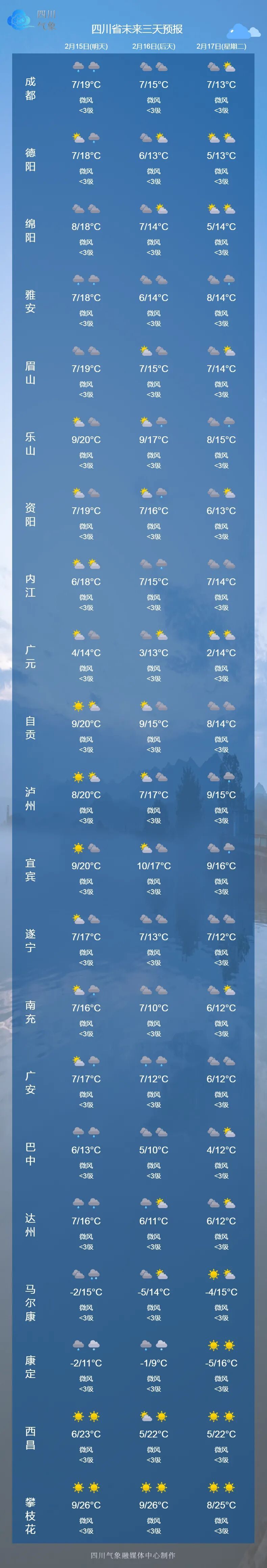中央气象台2月14日预计,未来3天,四川盆地西部和南部的部分地区有间歇性轻度霾。对空气质量变化特别敏感的朋友,出行注意防护。