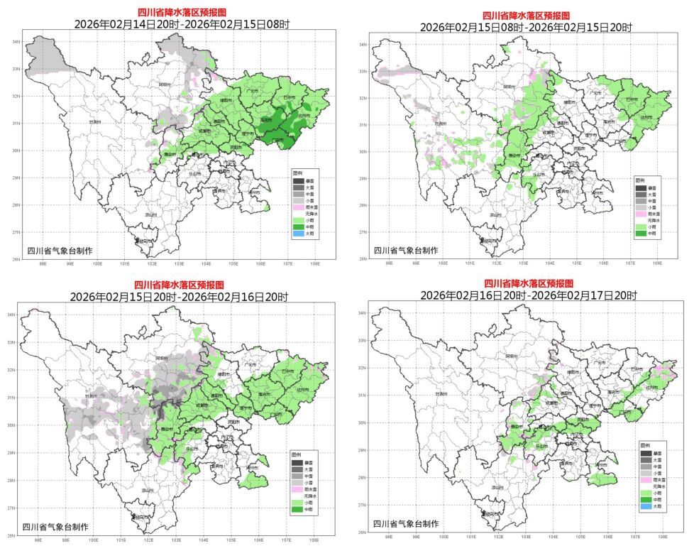 预计今天(2月14日)晚上到17日白天,川西高原北部中部有阵雪或阵雨,局地中到大雪,需防范雨雪天气和道路结冰带来的不利影响;川西高原其余地方和攀西地区大部晴间多云,午后到傍晚风力较大,森林草原火险气象等级较高,需加强火源管理和森林防火工作。