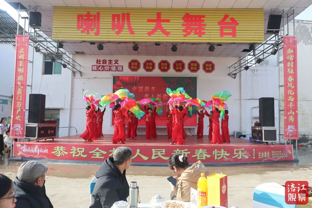舞台上的表演开始了。长扇舞率先登场,十几位村民手持彩扇,随着音乐翩翩起舞。领队夏冬琳也是喇叭村人,她告诉记者:“我们都是利用农闲时间排练的,就想把咱农民的精气神跳出来!”王伯会看得入神,手在膝盖上轻轻打着拍子,还不时和妹妹说笑。