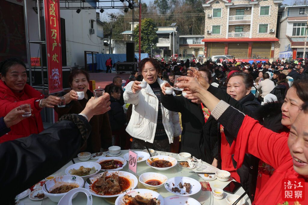 正午时分,“团圆坝坝宴”正式开席。红烧鱼、咸烧白、回锅肉、粉蒸肉、酥肉汤……菜品陆续上桌,热气腾腾、香气四溢。王伯会数了数,鸡鸭鱼肉样样俱全,“比往年多好几道菜呢!”