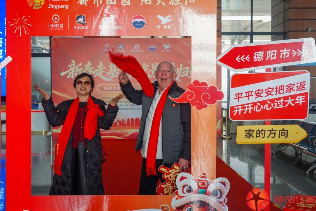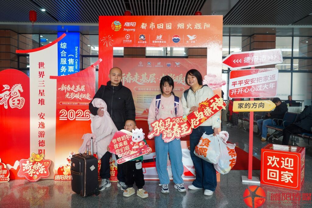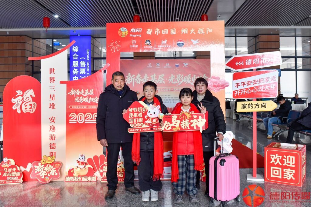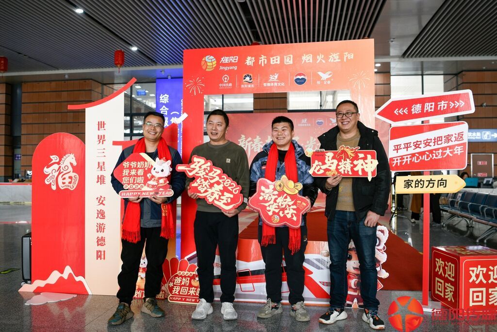 来自德阳市旌阳区摄影家协会的12名摄影师已在这里蹲点了两天,他们的“装备”和平时一样重,心里却异常轻快:“能够在这里给南来北往的旅客们拍一张团圆照,我们也很开心!这也是我们今年最有意义的‘年’味了。”