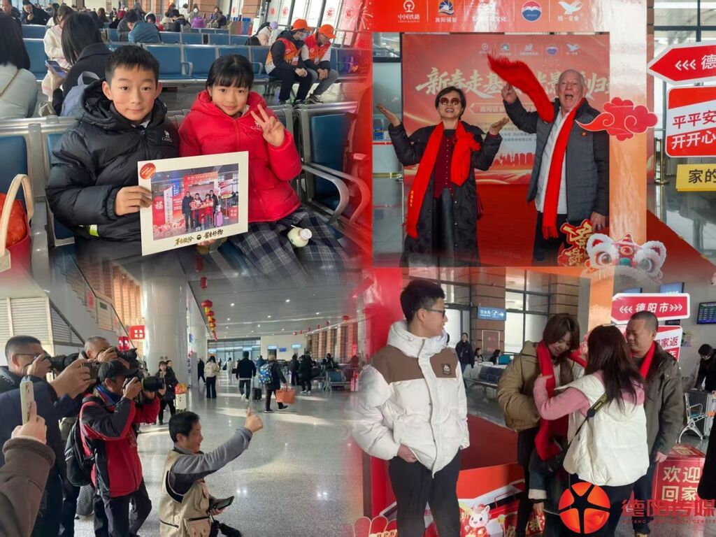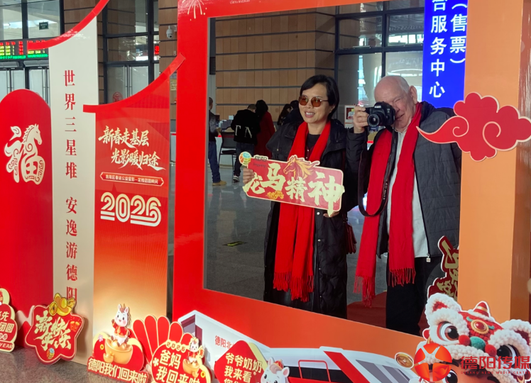 腊月廿五,春运第12天。德阳站里,旅客们步履匆匆、行囊满满,脸上的笑意写满对团圆的期待。在一楼候车大厅西侧,一处充满年味的免费拍照点却让归途的脚步稍稍放缓。几平方米的空间,没有华丽的布景,只有满满的家的味道;一声声清脆的快门,把归乡的期盼、即将团圆的喜悦,写成了一个个最动人的故事,一幅幅照片,记录下了最开心的瞬间。
