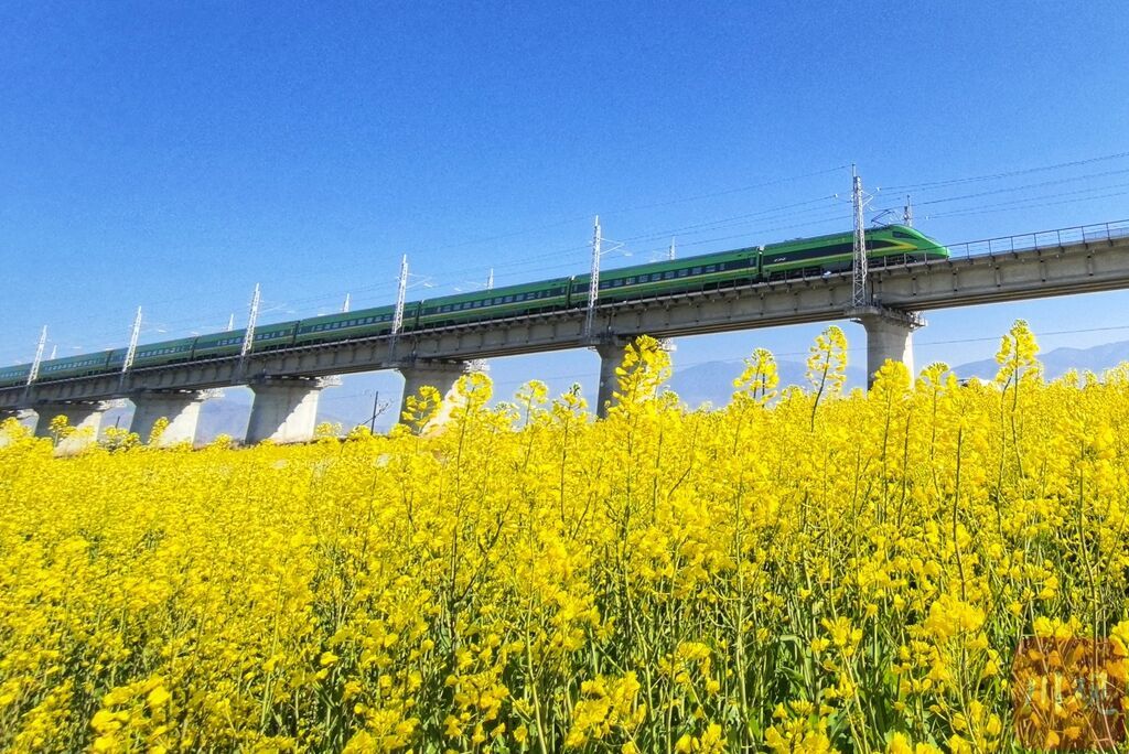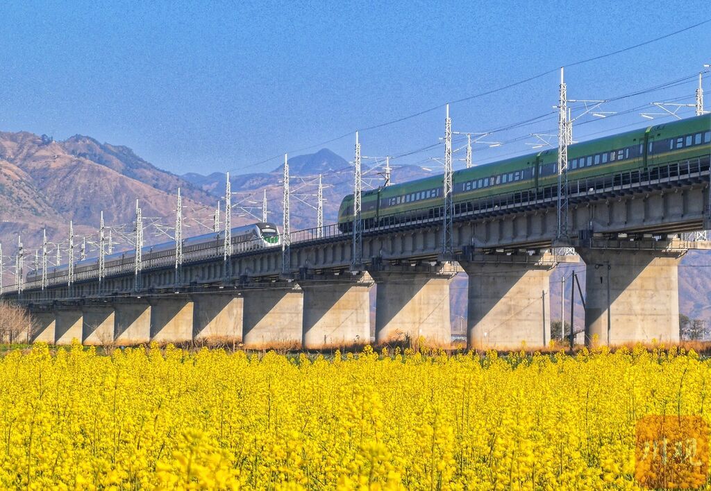 2月14日,凉山州西昌市新成昆铁路樟木大桥下成片油菜花盛放,运送旅客的动车组往返花海其间,为繁忙的春运增添了一抹动人的春色。