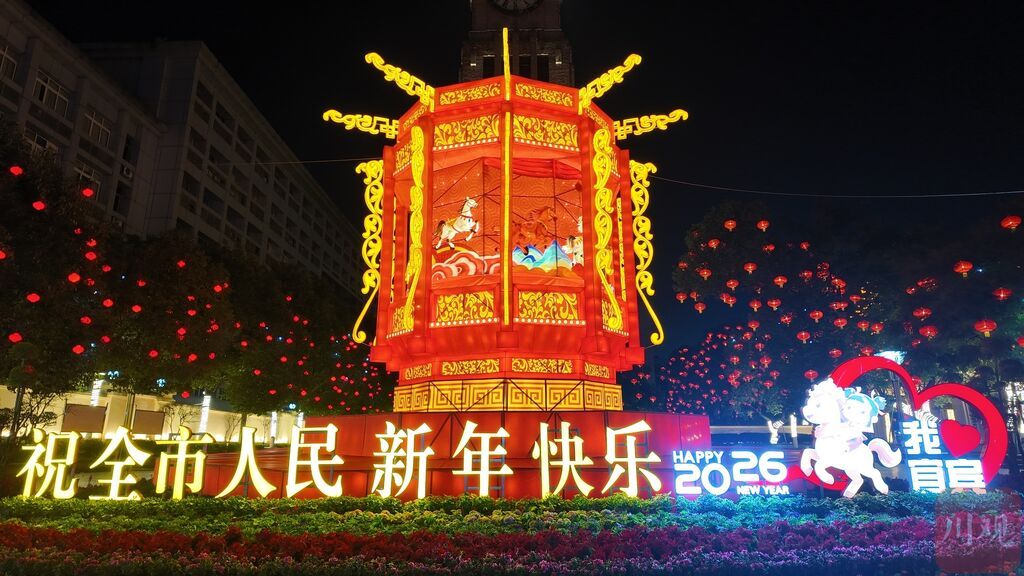 叙州区东楼、市政广场、长江公园一带,红灯笼高挂、流光溢彩,熊猫、骏马、哪吒等特色灯组错落有致,市民漫步其间,笑语盈盈。三江新区长江大桥“万马奔腾”灯组现代绚丽,与江面波光相映成趣。