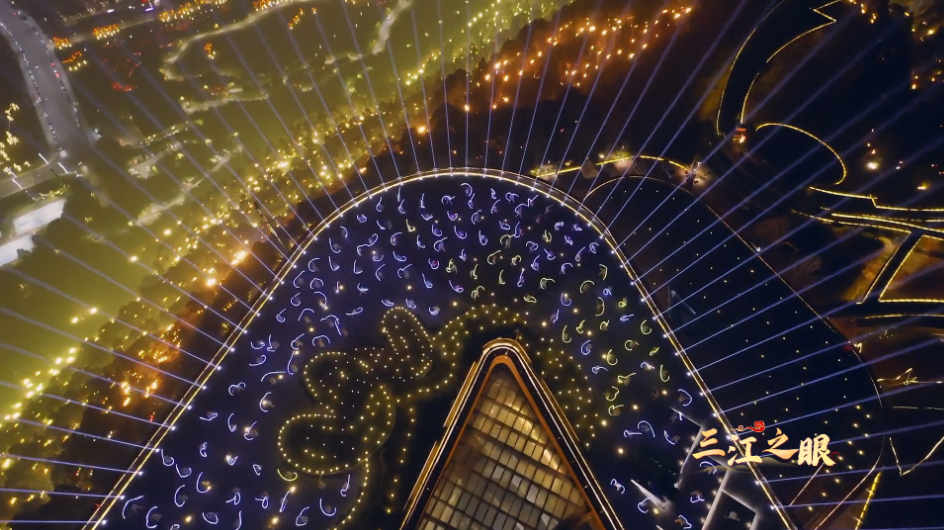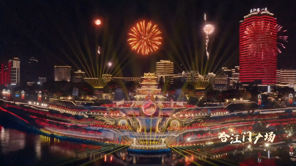 作为分会场主舞台,合江门以山水为幕、光影为笔,上演了一场精彩的视觉盛宴。前沿舞台科技与万里长江的壮阔山水完美相融,地面光影矩阵错落交织,灯光与江面倒影交相辉映,勾勒出独具川南特色的新春图景。