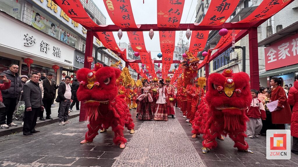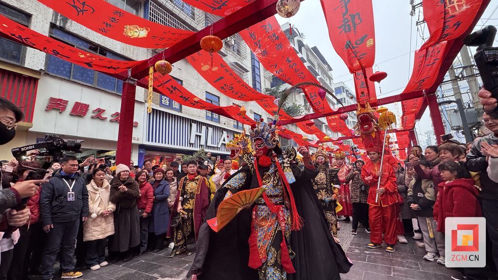 上午,巡游队伍从景区出发,瞬间点燃节日氛围。威风凛凛的舞龙舞狮腾跃翻转,金狮献瑞、祥龙贺岁,鼓乐齐鸣、气势恢宏;身着古风服饰的NPC列队巡游,衣袂飘飘、古韵盎然,与古色古香的街区相映成趣。巡游途中,川剧变脸绝活惊艳亮相,脸谱瞬息变换引得阵阵惊呼;活力满满的快闪舞蹈轻快灵动,将新春喜悦传递给每一位观众。市民游客纷纷驻足围观、拍照打卡,掌声、喝彩声此起彼伏,整条街道成为欢乐的海洋,尽显阖家团圆、其乐融融的节日景象。