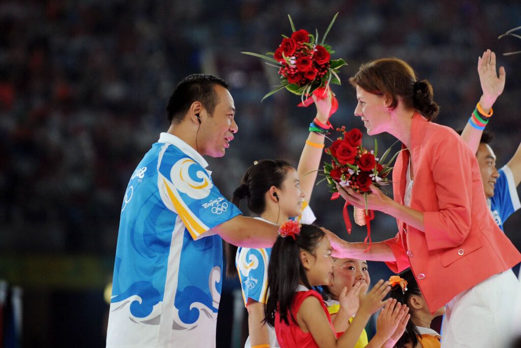 这是志愿者代表(左)在2008年北京奥运会闭幕式上接受国际奥委会运动员委员会新委员的献花(2008年8月24日摄)。 新华社记者李尕摄