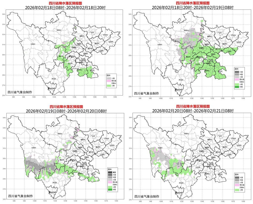 四川省气象台预计,18日至20日期间,川西高原东部南部多阵雪或阵雨,局地中雪,需防范雨雪天气和道路结冰带来的不利影响,川西高原其余地方和攀西地区大部多云到晴,午后到傍晚风力较大,森林草原火险气象等级较高,需加强火源管理和森林防火工作。