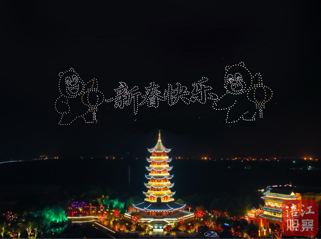 如果说白天的园区是温婉的国风画卷,那么夜幕降临后的表演则是硬核科技的实力秀场。作为全场的高潮,非遗绝技“火龙钢花”率先点燃激情。烈焰翻腾中,非遗艺师将千度铁水击向高空,炽热的铁水在夜空中瞬间冷却绽放,化作万点金星。而紧随其后的千架无人机天幕秀,则将这场视觉盛宴推向了未来维度。随着指令下达,千架无人机编队腾空,以苍穹为画布,用光束作笔墨,精准地变幻出腾龙、中国结等吉祥图腾。这不仅是一次光影的展示,更是算法与艺术的完美合谋,引得现场惊叹连连。