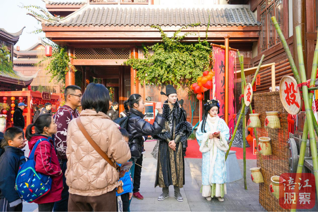 步入园区,浓厚的国潮风扑面而来。这里不仅是游乐园,更是一座被科技激活的传统文化博物馆。在“清韵小镇”,智能灯光系统巧妙点亮了树梢的红灯笼与巨型花灯,配合人工降雪系统营造出的漫天飞雪,让游客瞬间穿越至一个虚实交融的童话秘境。全家老小漫步于烟火市集,一边品尝地道小吃,一边与造型各异的主题花灯合影,科技带来的浪漫意境让团圆的每一刻都值得被永久珍藏。