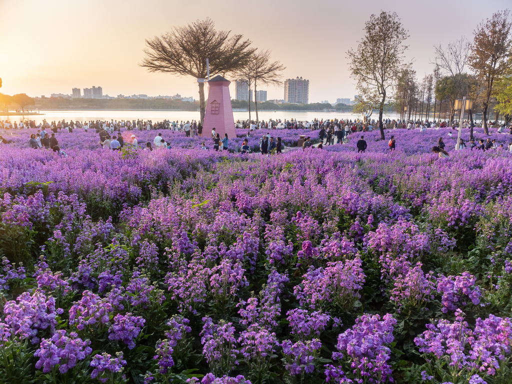 春节期间,佛山市顺德区顺峰山公园的百亩紫罗兰花迎来盛放期,吸引大批市民前来赏花拍照,乐享春色。