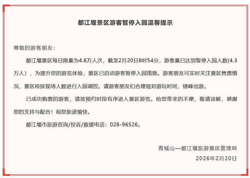 都江堰景区每日限量为4.8万人次,截至2月20日8时54分,游客量已达到暂停入园人数(4.3万人),景区已启动游客暂停入园措施。游客朋友可实时关注景区售票情况,景区将按现场人数进行入园调控。