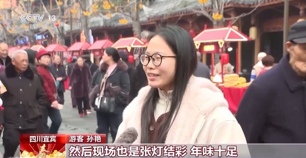 游客 孙艳:非常开心,现场张灯结彩,年味十足,非常漂亮。