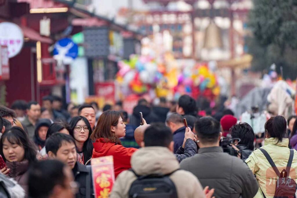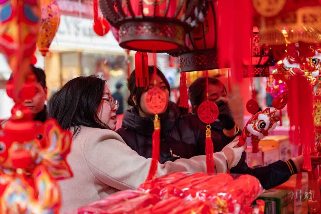 大年初二,广元武曌天街一派热闹景象。882米的唐风长街挂满红灯笼,熙熙攘攘的人群间,卖美食的、卖福字对联的、卖气球玩具的应有尽有,年味儿裹着烟火气扑面而来。田松友守着他的童装摊,货架上的红棉袄、红卫衣挂得满满当当,在喜庆的氛围里格外亮眼。