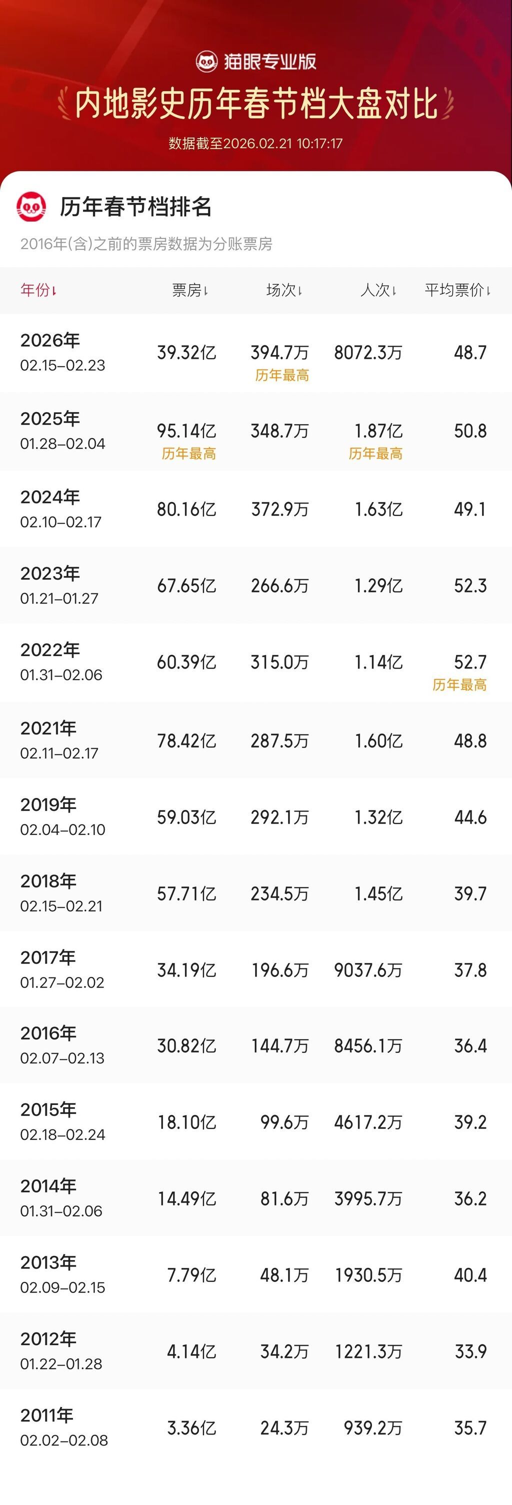 猫眼专业版数据显示,2026年春节档总场次超394.7万,刷新中国影史春节档总场次纪录,截至当前2026春节档总票房已达39.32亿。
