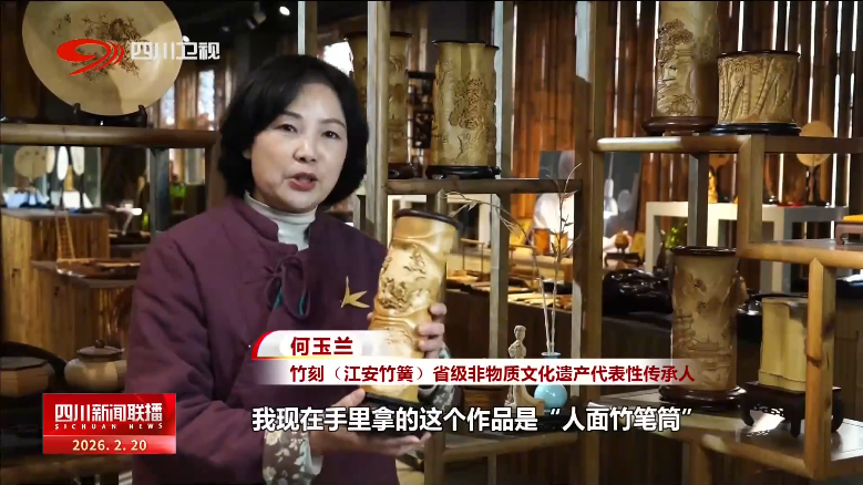 竹刻(江安竹簧)省级非物质文化遗产代表性传承人 何玉兰:我现在手里拿的这个作品是“人面竹笔筒”,用了我们江安竹簧最传统的全镂空雕刻、线雕、浮雕几种技艺在上面。