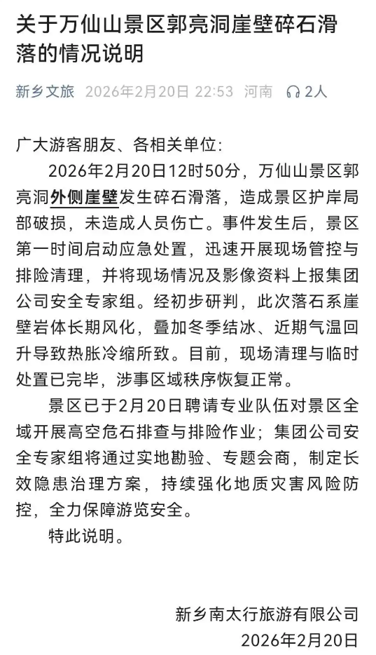 ·河南新乡万仙山景区落石事件通报:风化冻融及气温骤变致崖壁碎石滑落,无伤亡,已恢复开放。