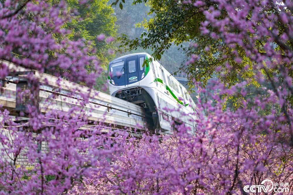 重庆轨道交通2号线佛图关段的美人梅迎春绽放,列车穿行花海,宛如开往春天的列车。