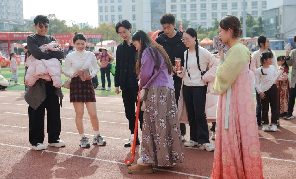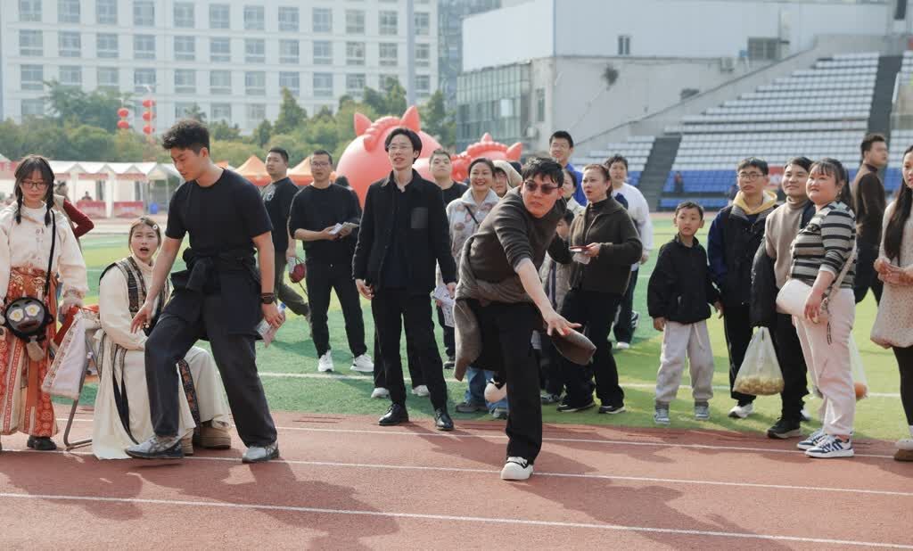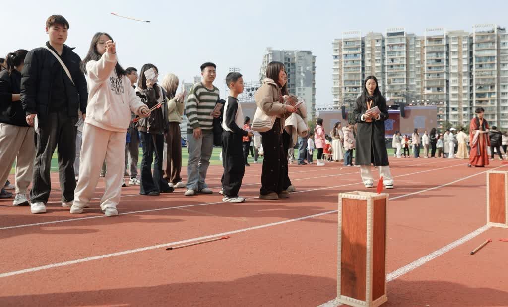 投壶区里,大朋友、小朋友们屏息凝神瞄准壶口,每当羽箭入壶便引来阵阵喝彩;蹴鞠场上,年轻人跃起射门,赢来围观群众掌声雷动。