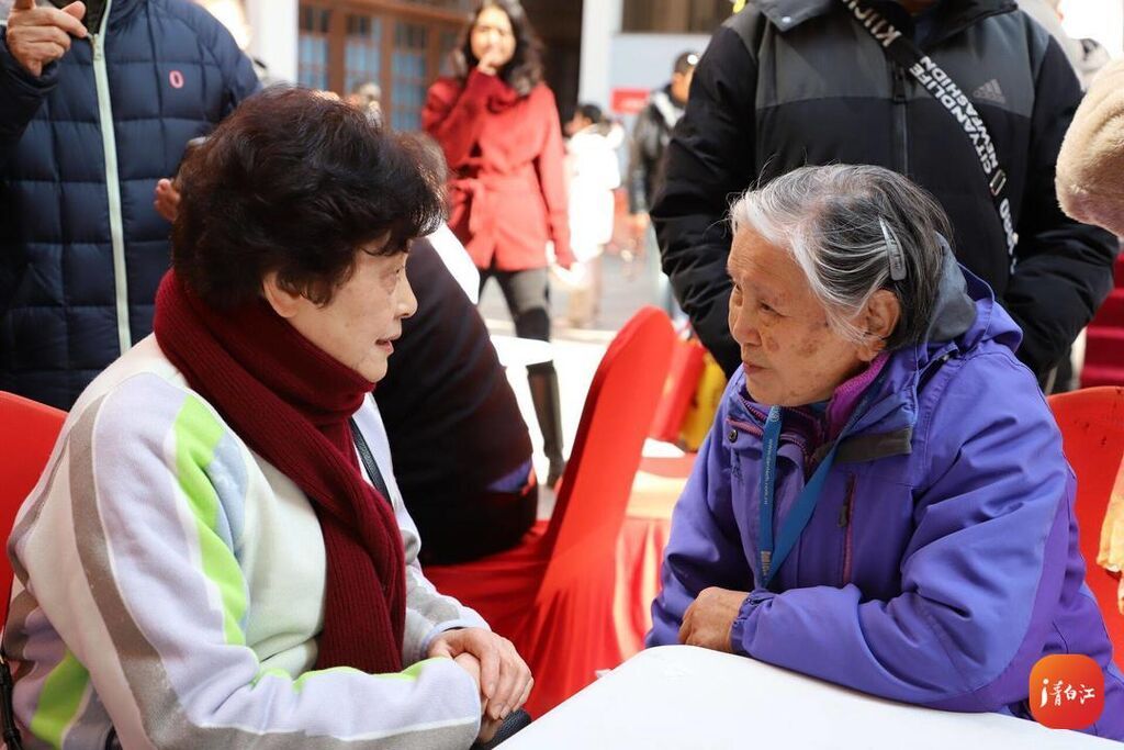 86岁的郑晋橪老人在人群中停下了脚步。她盯着不远处一位头发花白的老人,嘴唇开始颤抖,热泪盈眶。