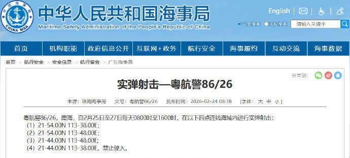 据中国海事局网站消息,珠海海事局发布航行警告,2月25日至27日,每天8时至16时,南海部分海域进行实弹射击,禁止驶入。