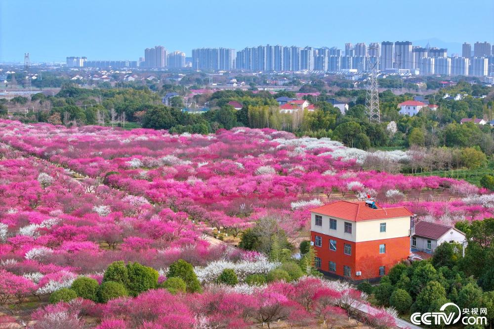 2月23日,浙江长兴千亩梅花迎春绽放,与错落有致的民居、道路等相映成景,勾勒出一幅和美乡村生态画卷。