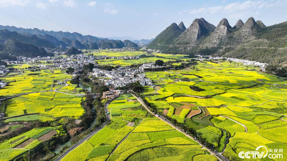 2月23日,贵州省黔西南州,兴义市万峰林景区的油菜花竞相绽放,花海与峰林、村寨勾勒出一幅幅美丽的春日画卷。