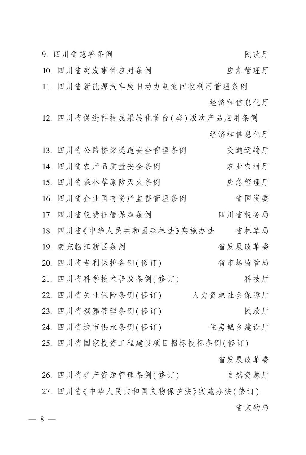 起草并提请省人大常委会审议四川省网络安全条例草案、四川省涉及国家安全事项的建设项目管理条例草案、四川省《中华人民共和国动物防疫法》实施办法(修订)草案、四川省《中华人民共和国集会游行示威法》实施办法(修正)草案、四川省植物检疫条例(修正)草案,加快推进四川省《中华人民共和国反电信网络诈骗法》实施办法、四川省非机动车管理条例、四川省突发事件应对条例、四川省公路桥梁隧道安全管理条例、四川省农产品质量安全条例、四川省企业国有资产监督管理条例、四川省110接处警工作规定、四川省气象灾害防御重点单位管理办法调研论证。